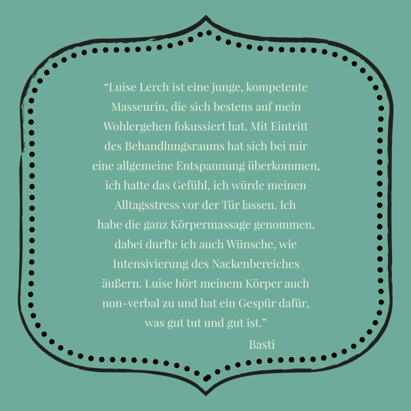 Luise schafft schon von der Begrüßung an eine angenehme vertrauensvolle Atmosphäre. Man fühlt sich direkt wohl bei ihr. Dies gelingt ihr anhand der Gestaltung des Raums, ihre emphatische Art und Freude daran gutes zu Tun. Sie geht individuell auf die Probleme ein und nimmt sich ausreichend Zeit um ihre Arbeit bestmöglich umzusetzen.